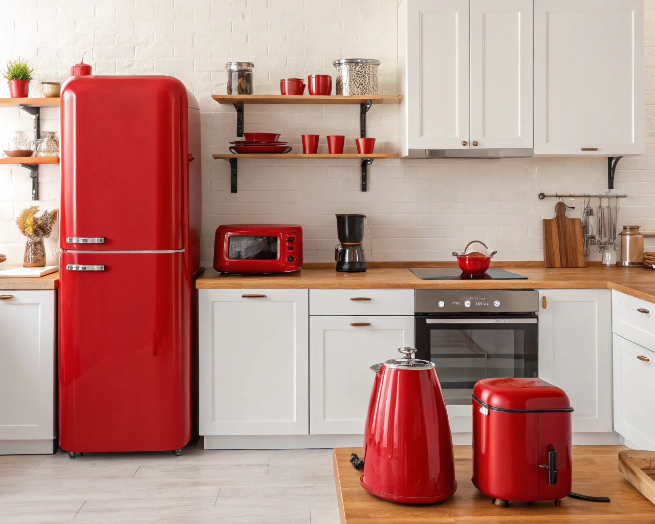 ・キッチン家電:トースターや炊飯器など、毎日使うアイテムは赤色で揃えると統一感が生まれます