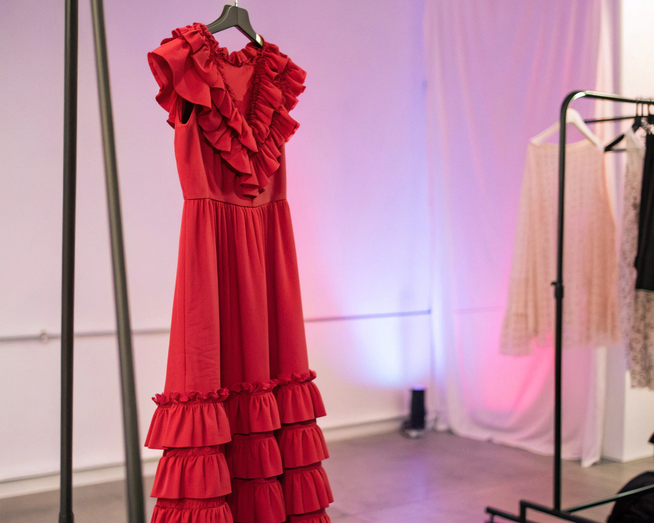 鮮やかな赤色は、装いに強いインパクトと華やかさをプラスします。赤色のファッションは視線を集めやすく、元気や自信、情熱的なイメージを与えることが一般的です。第一印象を大切にしたい場面や、コーディネートにアクセントを加えたい時に赤色フリルは効果的です。