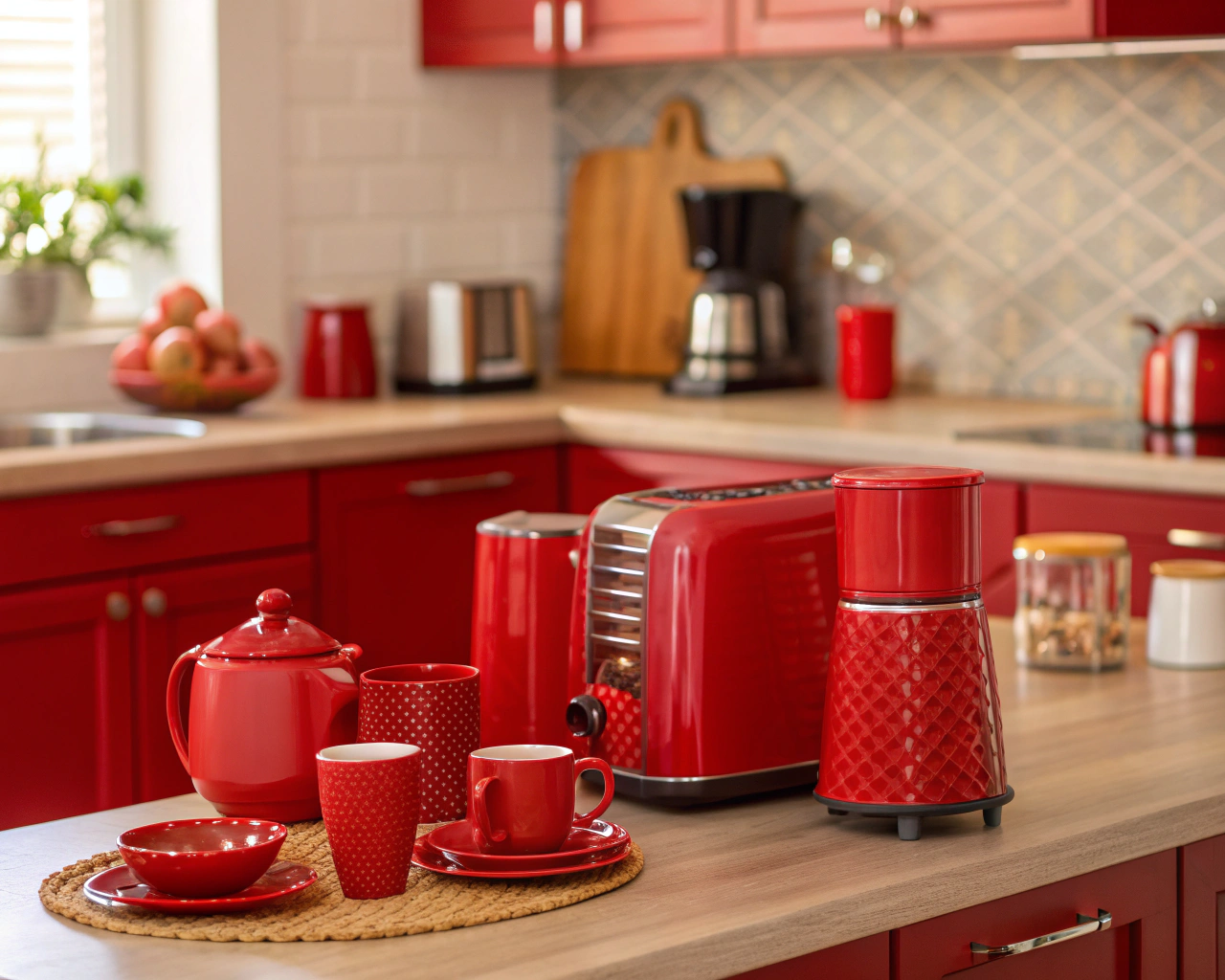 次に、赤色の濃淡や質感によって雰囲気が大きく変わります。例えば、光沢のある赤はモダンな印象、マットな赤は落ち着いた雰囲気を演出します。さらに、冷蔵庫や電子レンジなど大きめの家電を赤にすると空間の主役になり、小型のトースターやケトルでアクセントとして使うのもおすすめです。