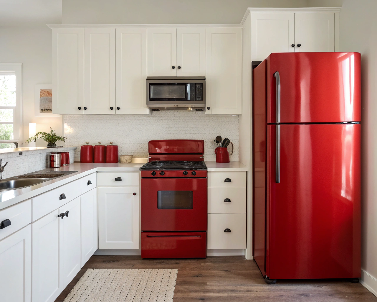 赤色家電をより引き立てるためには、配色バランスが重要です。赤色に映える色としては、白・黒・グレーなどの無彩色や、木目調のナチュラルカラーが挙げられます。これらの色と組み合わせることで、赤の鮮やかさが際立ち、洗練された印象になります。