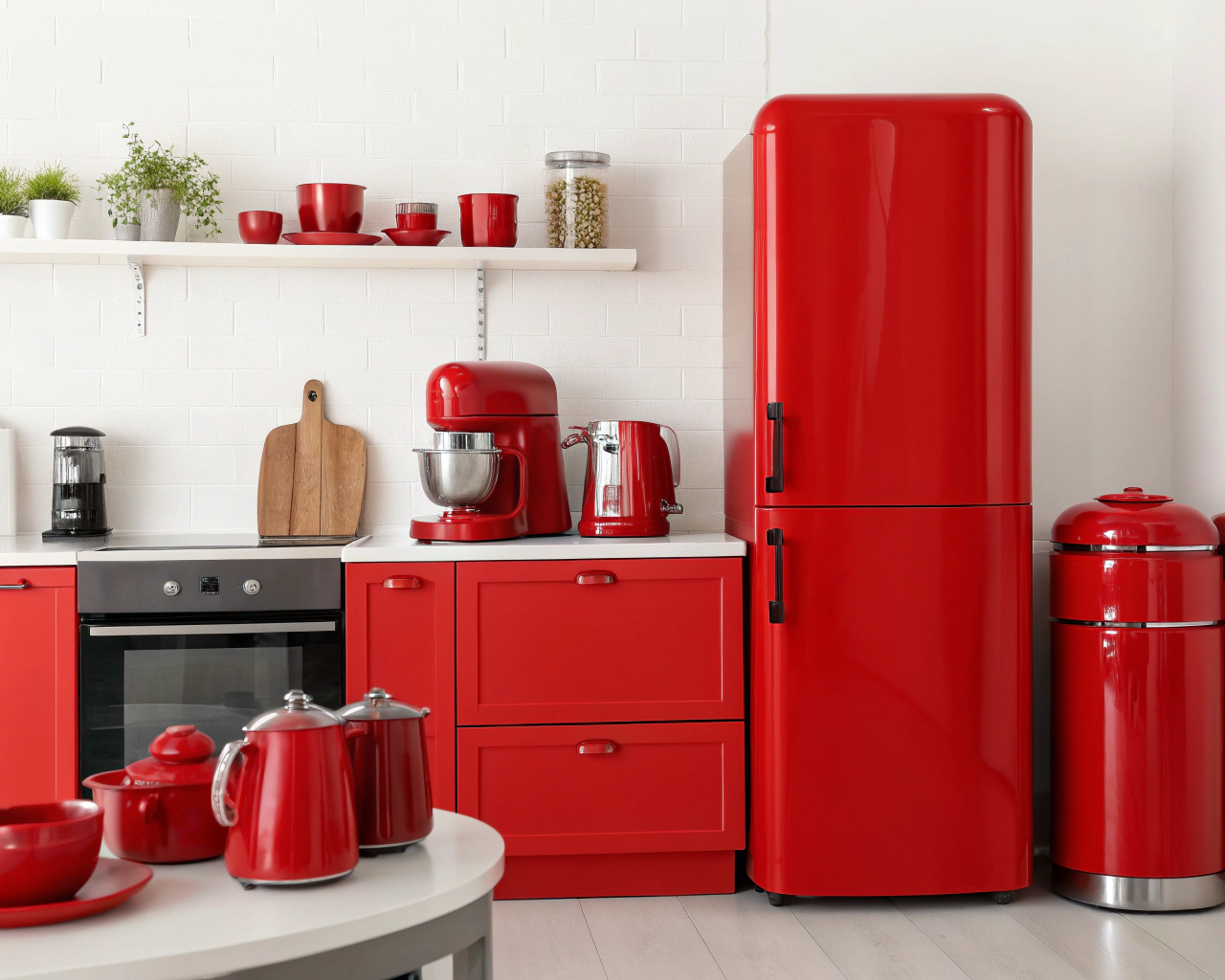 活力・情熱を象徴 冷蔵庫や電子レンジ、トースターなど目立つ家電で色を統一 赤色の使いすぎはエネルギー過剰に繋がりやすい