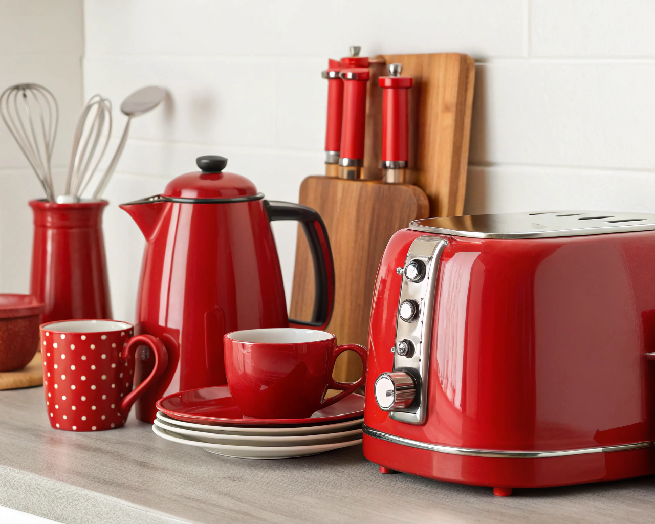 赤色の家電製品は、キッチン空間に活気や華やかさをもたらすアイテムとして注目されています。特に、トースターや電気ケトル、電子レンジなどの赤い家電をアクセントとして配置することで、無機質になりがちなキッチンが一気に明るくなります。赤色は視覚的なインパクトが強いため、ポイント使いを意識することが大切です。