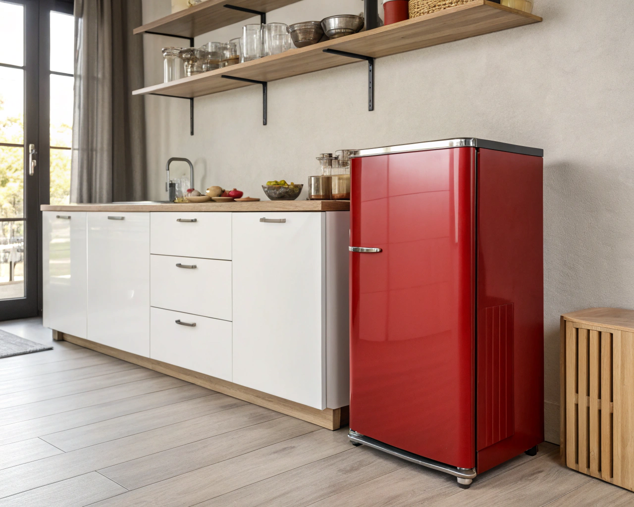 赤色の電化製品は、キッチンの印象を一気に華やかに変える力があります。特にコンパクトフリーザーなどの赤い家電を主役に据えることで、空間にアクセントを加えつつ、おしゃれな雰囲気を演出できます。赤色は視覚的なインパクトが強く、インテリアの主役として存在感を放つため、他の小物や家具と調和させることが重要です。