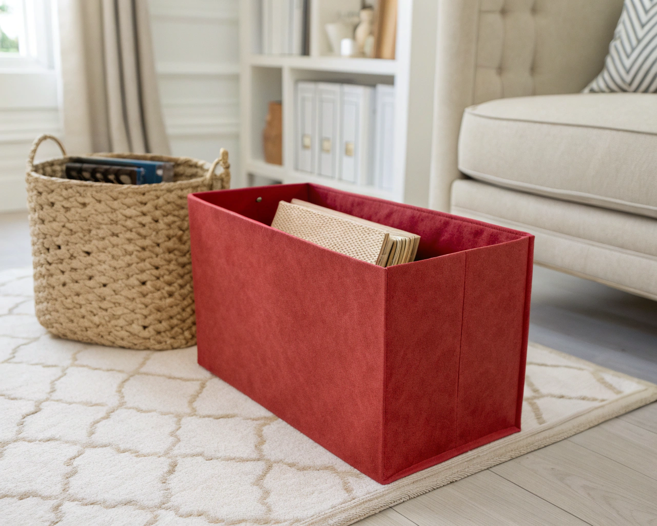 赤色ペーパーケースは、リビングや書斎、子供部屋などさまざまな場所で活躍します。たとえば、デスク周りに配置すれば、散らかりがちな書類やメモをすっきりと整理しながら、空間に華やかさを加えることができます。特に赤色の持つエネルギッシュな印象は、作業効率や集中力の向上にも期待が持てるでしょう。