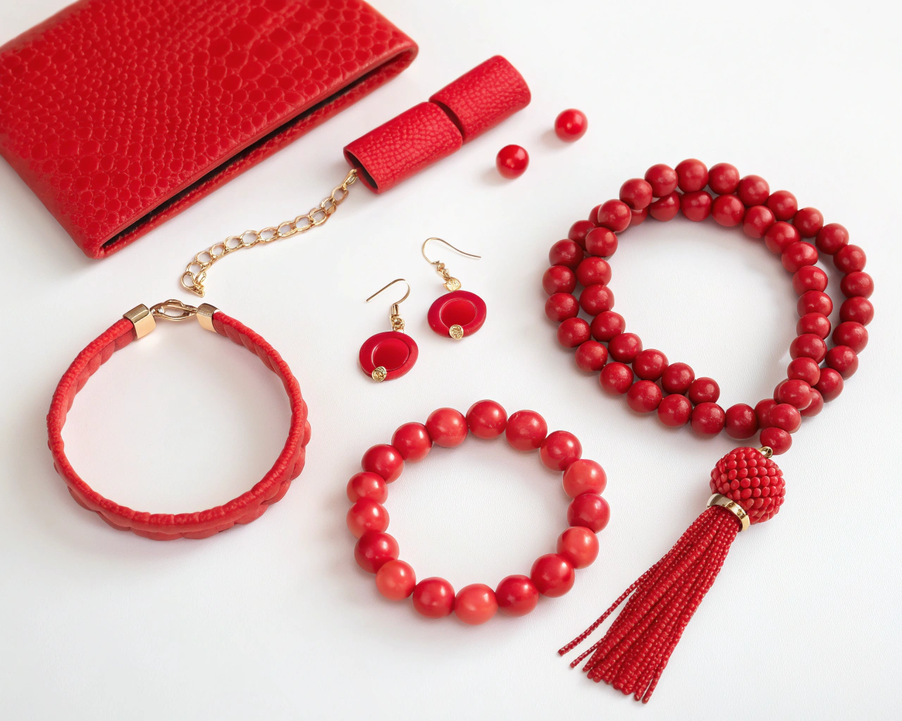 恋愛運や仕事運を意識するなら、赤色の小物はデザインや素材にもこだわって選ぶのがポイントです。例えば、赤い石があしらわれたブレスレットは「情熱」や「愛情」を象徴し、恋愛成就のお守りとして人気があります。